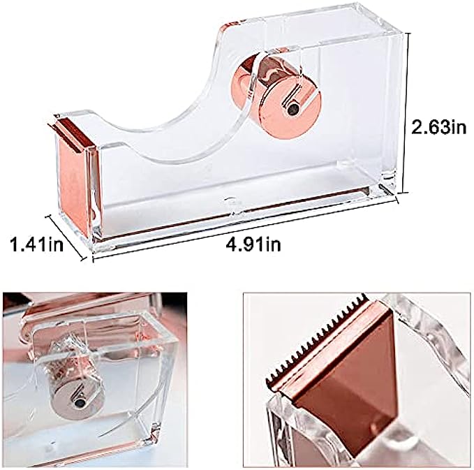 • 【ADD STYLE AND ELEGANCE TO YOUR DESK 】This tape dispenser featured in high transparent acrylic materials partners beautifully with the metallic rose gold cutting blade. It brings a modern touch to your desk that will stand out from the rest of your equipment and catch the eye of anyone.