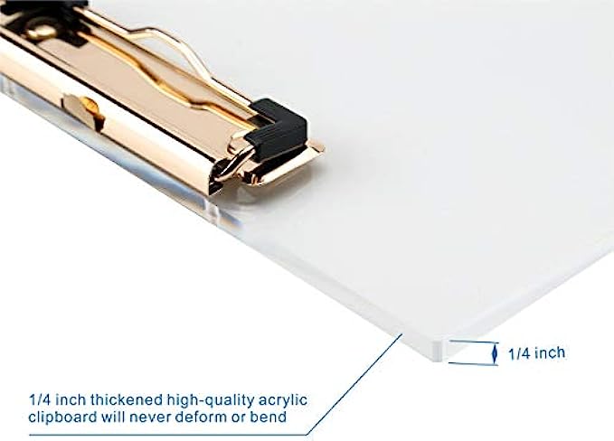 • Our Acrylic Clipboard is up to 1/4 inch thick and does not warp or bend. High-end acrylic is as transparent as crystal with a simple and elegant design and it will be a enjoyment to use in your hands