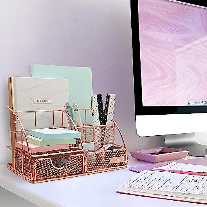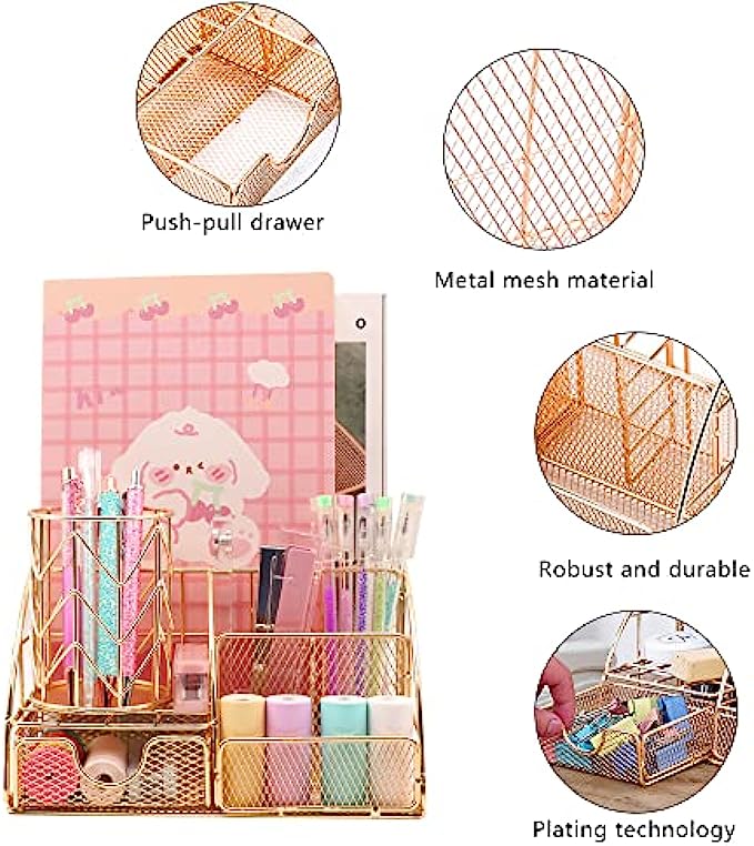Creechwa Rose Gold Desk Organizers and Accessories for Women, Metal Mesh Desk Organizer, Cute Office Supplies with Sliding Drawer and Pen Holder for Home School and Office