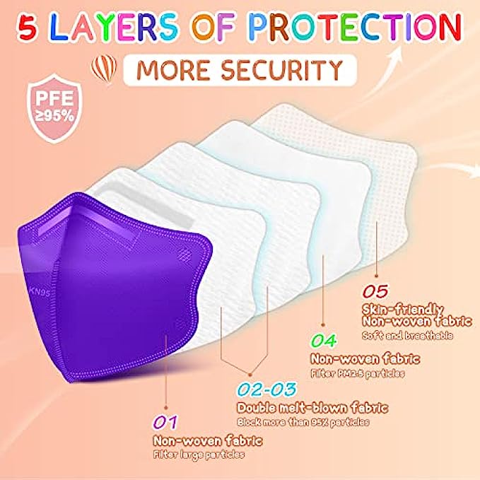 • MULTI-COLOR KN95 KID MASKS: Sized at 5.51 inches x 7.08 inches, and the length of the ear loop is 3.2 inches, the stretched length is 7.5 inches. With 5 colors of KN95 kid masks: purple*10pcs, orange*10pcs, yellow*10pcs, green*10pcs, blue*10pcs, total 50 PCS kids face mask. Each kn95 mask comes with a different color ear loop, It can increase the fun of children wearing masks, matching various clothes to show their personality.