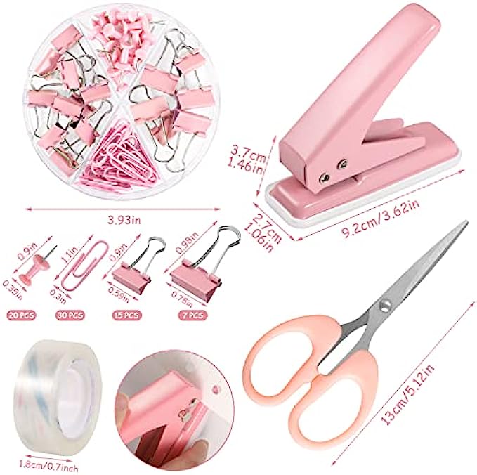 • 【Size Details】You will receive pink desk accessory kit, including 1 stapler (4.72*1.3*1.97inch), 1 staple remover (2.17*0.6inch), 1 tape dispenser (4*2.36*1.6inch), 1 Hole punch (3.66*1*1.38inch), 1 roll of transparent tape (0.7inch), 1 box of binder clips (3.93inch), 1000 staples (24/6), 1 scissors (5.12*2.44 inch).(Please note: the set comes in 2 shades of pink, the hole punch is dark pink, please confirm before purchasing)