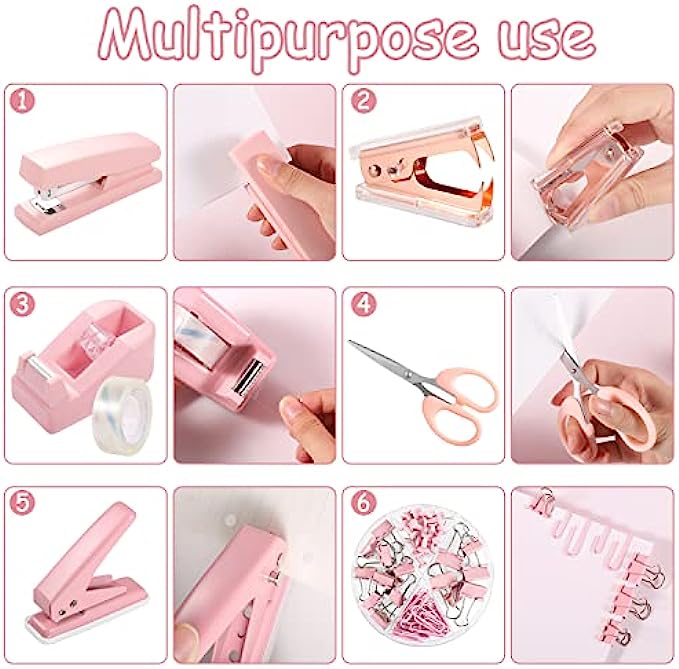 • 【Durable Material】The pink stapler and tape dispenser set are made of high-quality plastic material, which is durable and has strong stability, the hole punch and stapler are made of high-quality metal material, which is strong and unbreakable, and the binder and scissors are also easy to use