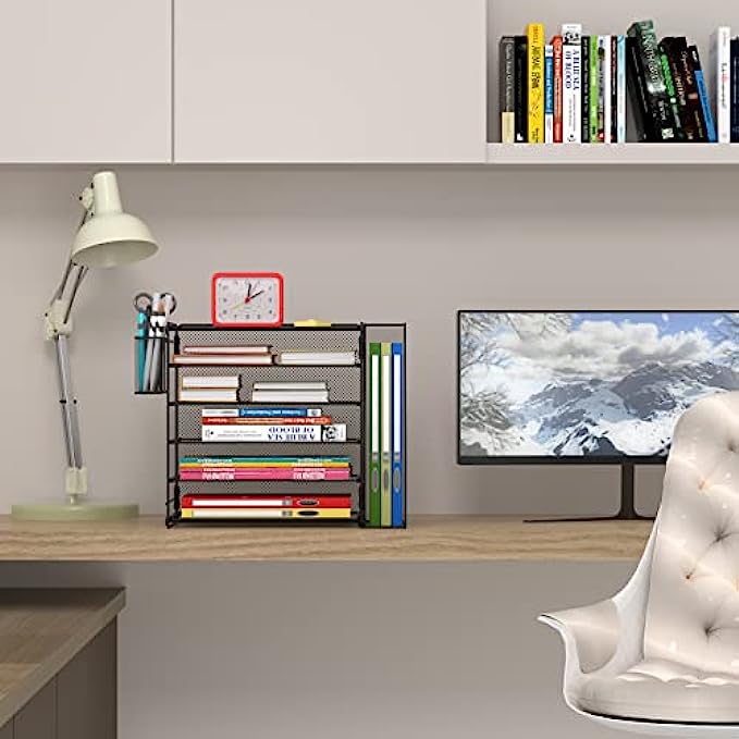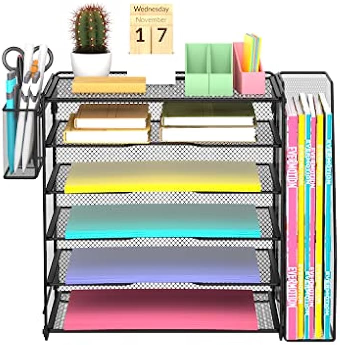 Samstar Mesh Desk Organizer, Paper Letter Tray with 5 Tier Racks Shelves,1 Extra Vertical File Sorter and Pen Holders for Office Supplies,Black