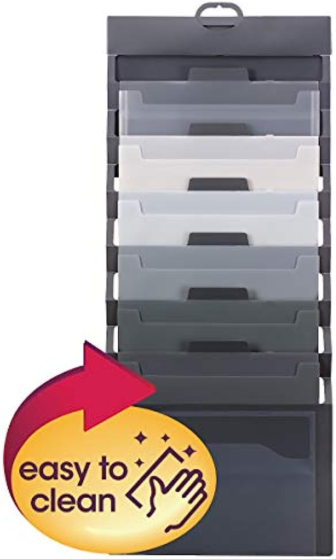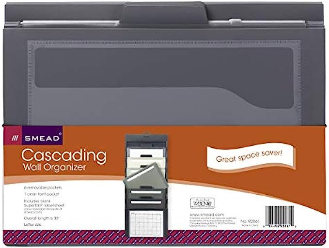 Includes 1 letter size hanging wall organizer (14-1/4" W x 36-1/4" H when open) with 6 removable file folder pockets in neutral colors, 1 clear front pocket and 1 blank label sheet