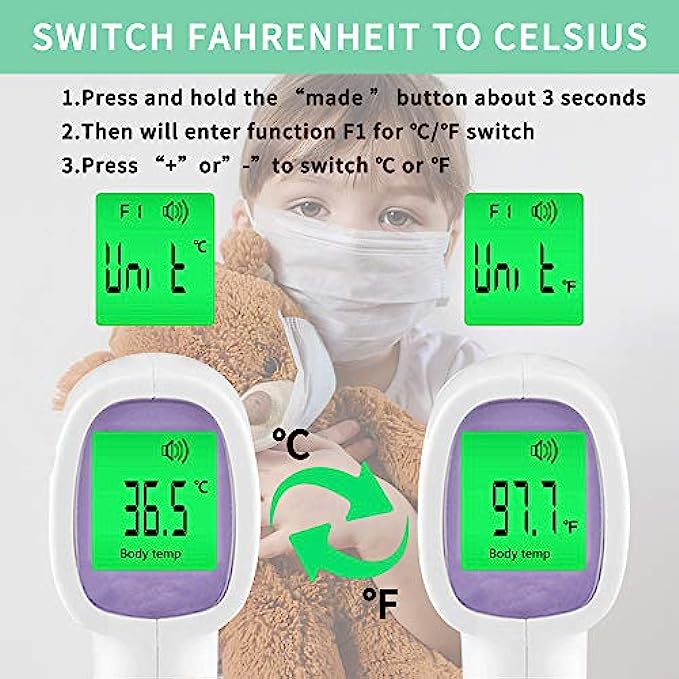 • ➤【Friendly Design】The no-touch digital thermometer has a non-slip design, and the LCD display is clear and easy to read, the display can be used at night without in light. The thermometer is equipped with an internal memory that can store up to 40 sets of data readings that allows you to keep track of the historical temperature changes for you and your family.