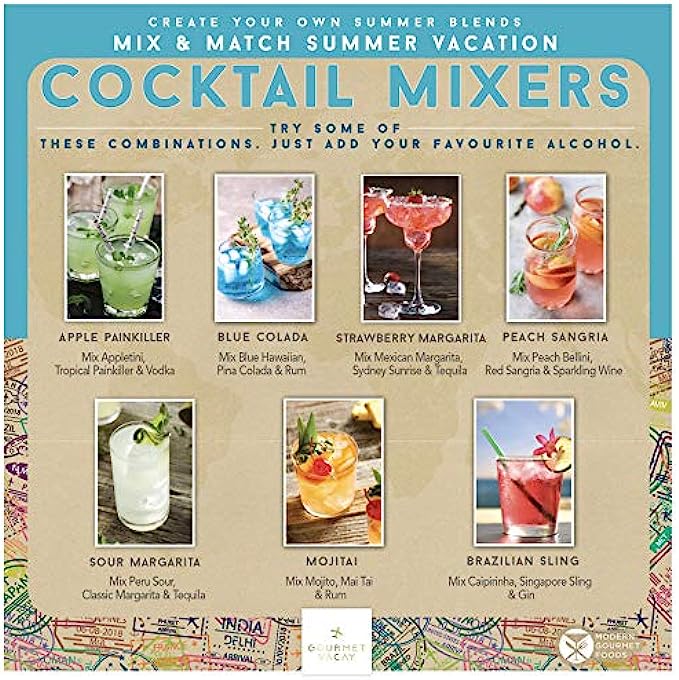 • MIX AND MATCH FLAVORS include Apple, Blue Hawaiian, Moscow Mule, Pina Colada, Margarita, and more