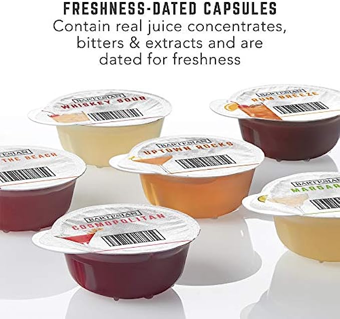 • HIGH-QUALITY INGREDIENTS. Cocktail mix capsules contain a premium mix of precisely measured, high-quality ingredients like real fruit juice concentrates and extracts. They're even dated for freshness.