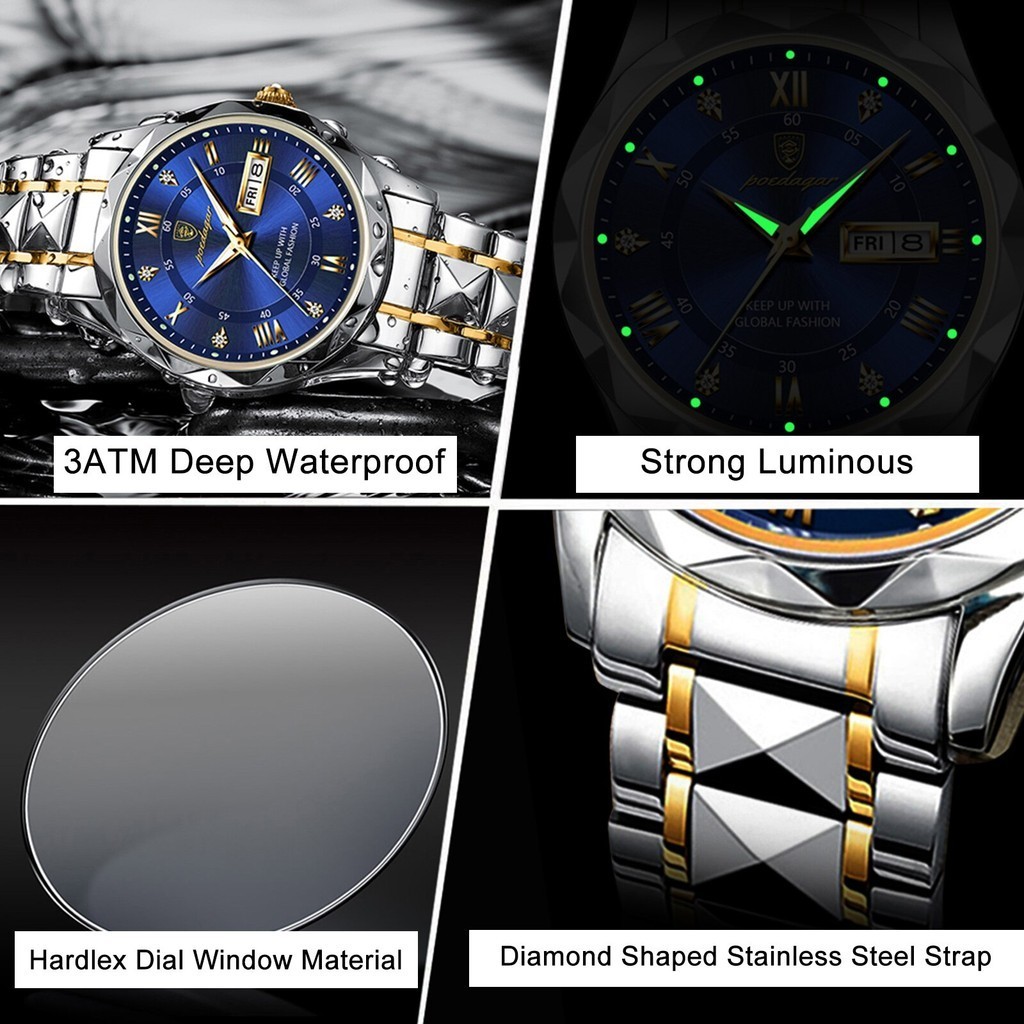 POSHI Waterproof Mens Watches Quartz Business Stainless Steel Silver Metal Multifunction Calendar Luminous Casual Men Watch