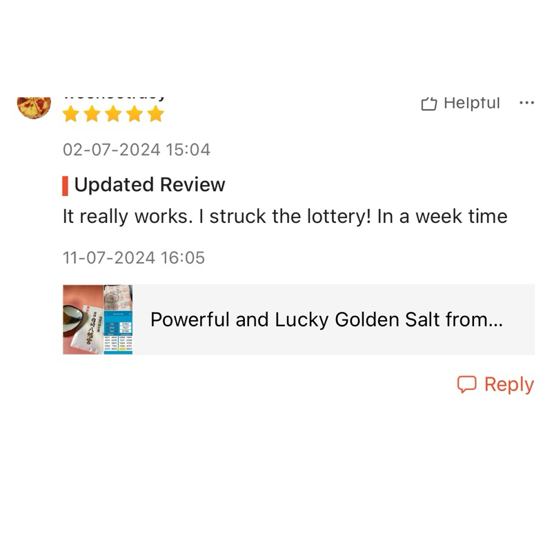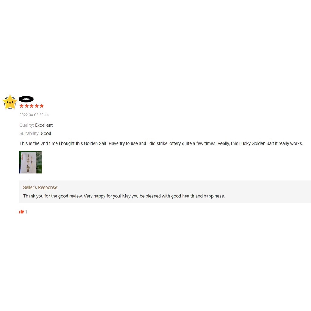 I have received my powerful and lucky golden salt in a very good condition . Thank you seller. This is my first time purchase. I really hope this will bring me good luck. If good, will definitely introduce to all my friends……