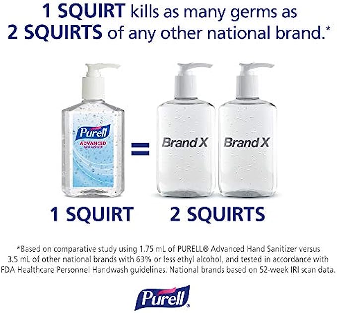 • 2X Sanitizing Strength. 1 squirt of Purell Advanced Hand Sanitizer equals 2 squirts of other national brands. Outperforms other sanitizers ounce-for-ounce
