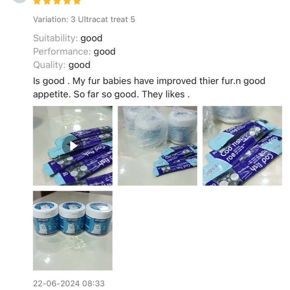 Suitability:suitable Performance:does the job Quality:awesome This is a repurchase. My cat loves the chicken flavour and now I’m getting her the fish flavour. Seller was kind to send 3 scoops upon request and 10 sticks of new wet treats!! Item came fast and well packed, very satisfied ?