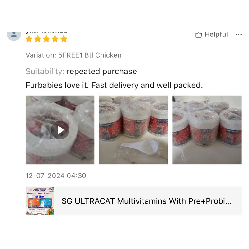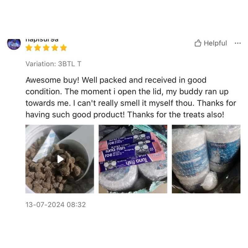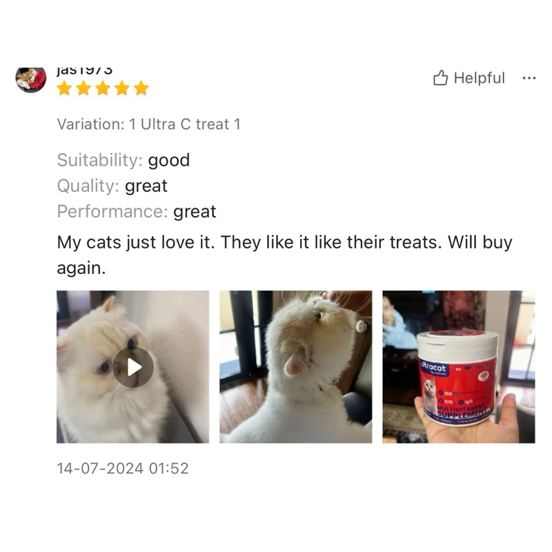 Quality:good! Performance:good! Suitability:good! My cats loved it! 3rd purchased because its suitable for my cats and they loved it! Saw the changed and benefits in my cats. Really helped my underweight cat with her appetite. Thanks seller! & its cheaper compared to other seller. Will buy again! ☺️