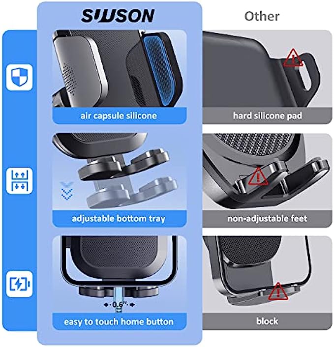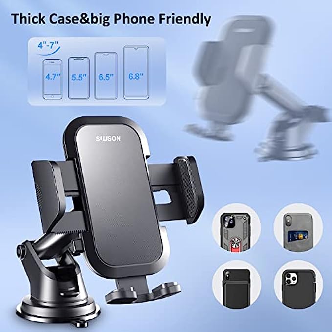 • [Easy operation, strong compatibility] One-handed lightly touch, release or lock the phone within a few seconds-super convenient to use while driving. The SUUSON car phone holder mount has adjustable feet, stronger and wider clips, making this phone holder for car suitable for all (4.0"-7.0") mobile phone and mobile phone case combinations.