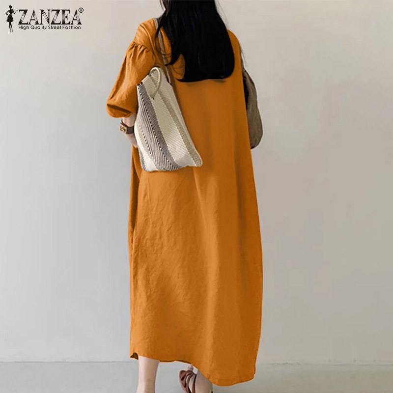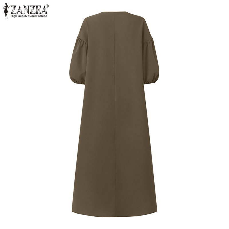 ZANZEA Women Fashion Elegant Solid V-Neck Three Quarter Luxurious Puff Sleeve Side Pockets Casual Dresses
